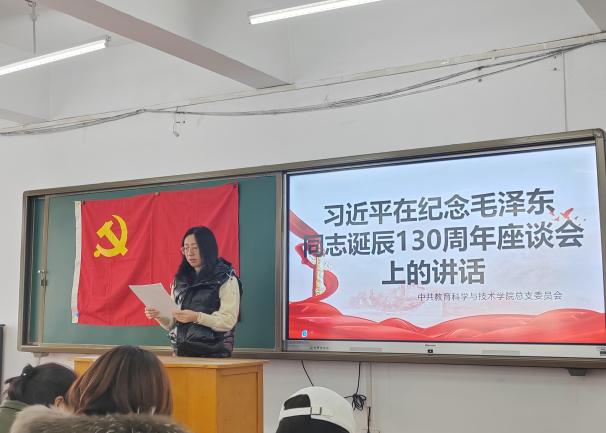 2024年1月8日,在教科院406教室,召开“习近平在纪念毛泽东同志诞辰130周年座谈会上的讲话”主题党日活动,活动由田莺领学。活动过程中教师认真学习了理想理论与教育教学,育人理念与师风师德,历史使命与责任担当,教育改革与创新发展相关方面的知识。
