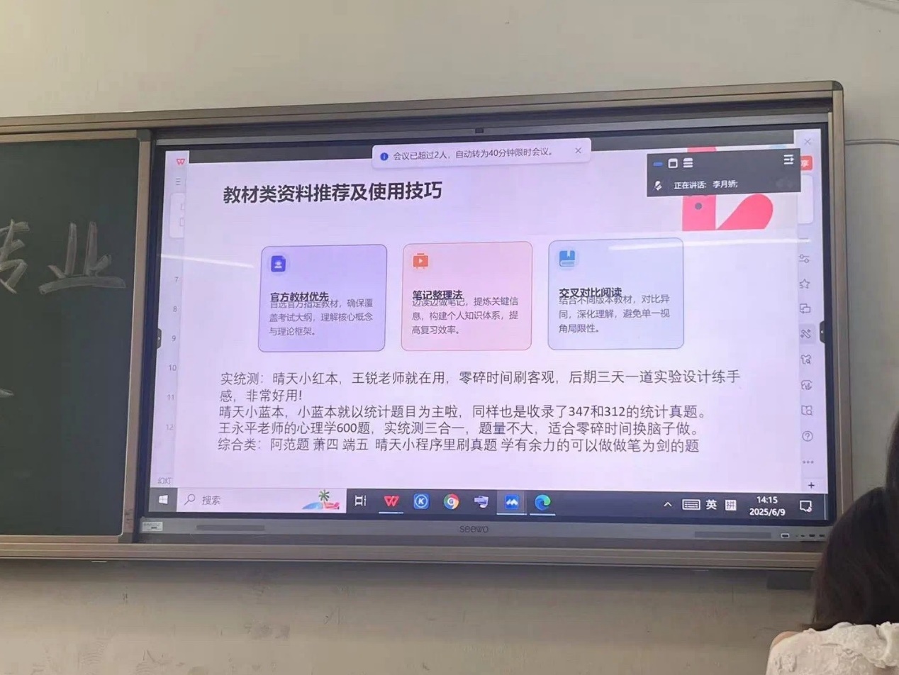 为帮**研学子明晰考研方向,提供宝贵经验借鉴掌握科学备考方法,增强考研信心6月10日,教科院201教室举办应用心理学专业考研经验分享会。本次活动特邀21级成功上岸的王禹心与19级二战圆梦的李月娇两位学姐担任主讲嘉宾应用心理系主任王颖老师和辅导员黄子琪老师出席本次活动
