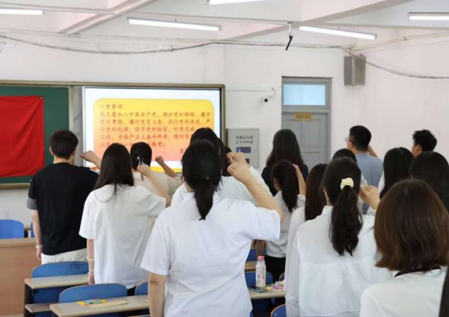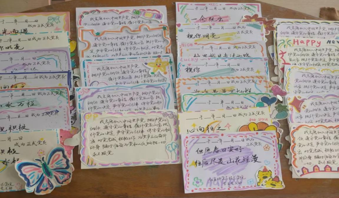 党员教师在学弟学妹们亲手制作的“毕业生党员专属誓词卡”上签字,送给每一位毕业生党员美好的祝福。最后全体党员面向党旗,高举右拳,在铮铮誓言中重温入党宣誓。