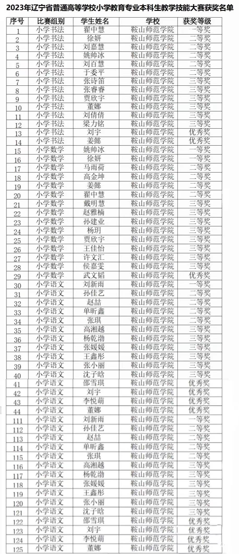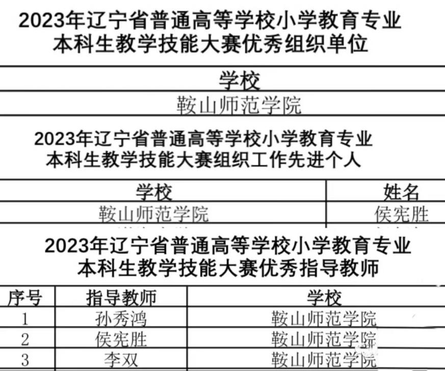 10月21日,由辽宁省教育厅主办的2023年辽宁省普通高等学校小学教育专业本科生教学技能大赛在大连大学圆满落幕。本次大赛,共有来自省内7所师范院校184名小学教育专业选手参加角逐。最终,我校教育科学与技术学院小学教育专业选派的13名选手,在小学数学、小学语文、小学书法三个组别共获一等奖4个、二等奖13个、三等奖20个、优秀奖7个。其中,姚帅冰、徐妍同学获得小学数学组一等奖,刘新雨同学获得小学语文组一等奖,翟中慧同学获得小学书法组一等奖。教科院小学教育专业负责人侯宪胜老师获得组织工作先进个人。教科院侯宪胜老师、李双老师、孙秀鸿老师获得优秀指导教师。k8凯发获得优秀组织单位。