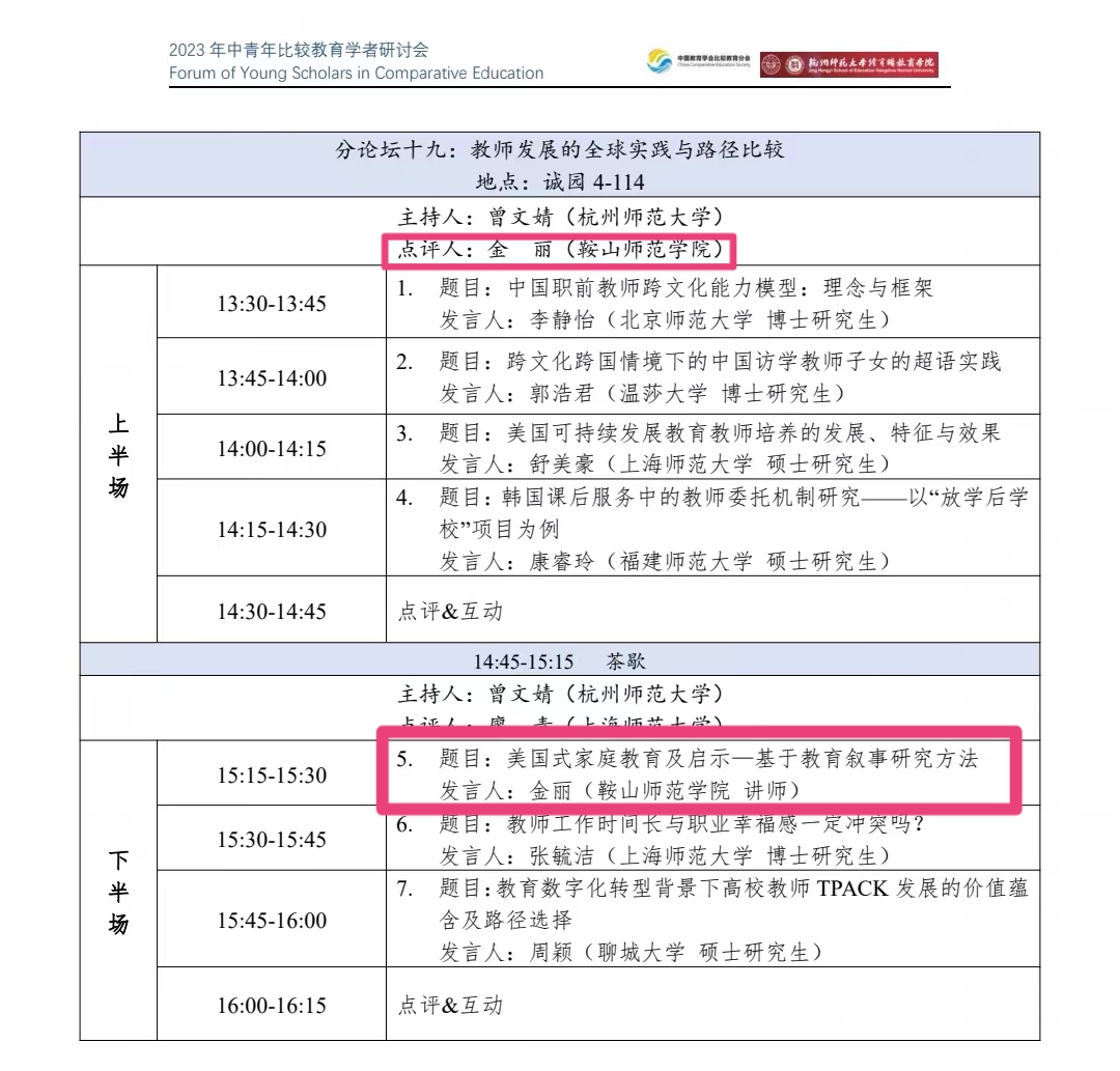金丽在“教师发展的全球实践与路径比较”分论坛担任点评人,并做题为“美国式家庭教育及启示—基于教育叙事研究方法”的发言。金丽的发言从叙事研究的视角阐释了美国家庭教育的现状、特点以及与中国家庭教育的不同之处,和美国家庭教育带给我们的启示,为中国学者研究美国家庭教育提供了有价值的借鉴。